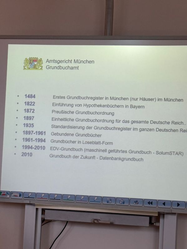 Am 27.11.2025 besuchte die Berufsschulklasse I11A22 der Immobilienkaufleute das Grundbuchamt München. Nach dem Durchlaufen der Sicherheitskontrolle wurde die Klasse in einen Saal geführt, in dem zunächst die Geschichte der Grundbücher erläutert wurde. Ein besonderes Highlight war die Möglichkeit, historische Grundbücher selbst in die Hand zu nehmen.