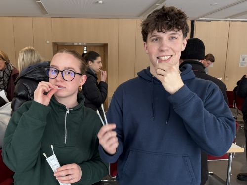 Nach dem Vortrag durften alle, die an der Aktion teilnehmen wollten, mitmachen. Sie hatten die Möglichkeit, sich direkt vor Ort mit einem Wattestäbchen zu testen und sich bei der DKMS zu registrieren. Dies ging schnell, unkompliziert und völlig schmerzfrei. Gemeinsam mit dem DKMS-Team half ich dabei und unterstütze meine Mitschüler, die jetzt potenzielle Stammzellspender werden und vielleicht eines Tages einen erkrankten Menschen retten können.