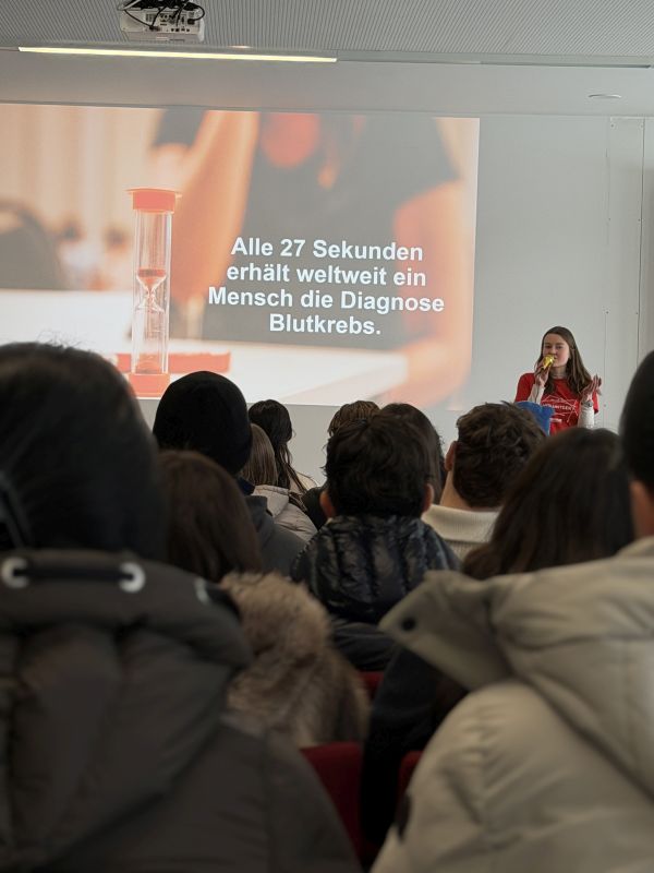 Zu Beginn besuchte ein Team der DKMS unsere Schule und hielt einen informativen und anschaulichen Vortrag. Dabei erklärten sie, was Leukämie ist, warum Stammzellspenden so wichtig sind und wie einfach es sein kann, Leben zu retten. Viele Mitschüler hörten aufmerksam zu und stellten interessierte Fragen.