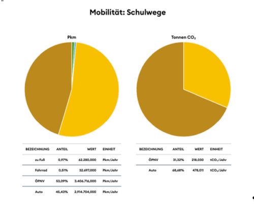 Das Ergebnis der Mobilitätsabfrage besteht darin, dass 72% des Gesamt-Co2-Ausstoßes die Mobilität verursacht. Dieser hohe Prozentsatz ist der Situation geschuldet, dass unsere Schüler*innen zu 53% mit dem ÖPNV fahren und zu 43% mit dem Privatauto. Einige Schüler*innen haben weite Wegstrecken aus abgelegenen Gegenden bis zum Schulgelände von ca. 120 km und mehr täglich. Klassenfahrten werden zu 98% mit dem ÖPNV zurückgelegt. Unsere Mobilitätsabfragequote bei unseren Schüler*innen lag bei über 88%. Dafür hat uns das Referat für Bildung und Sport besonders belobigt.